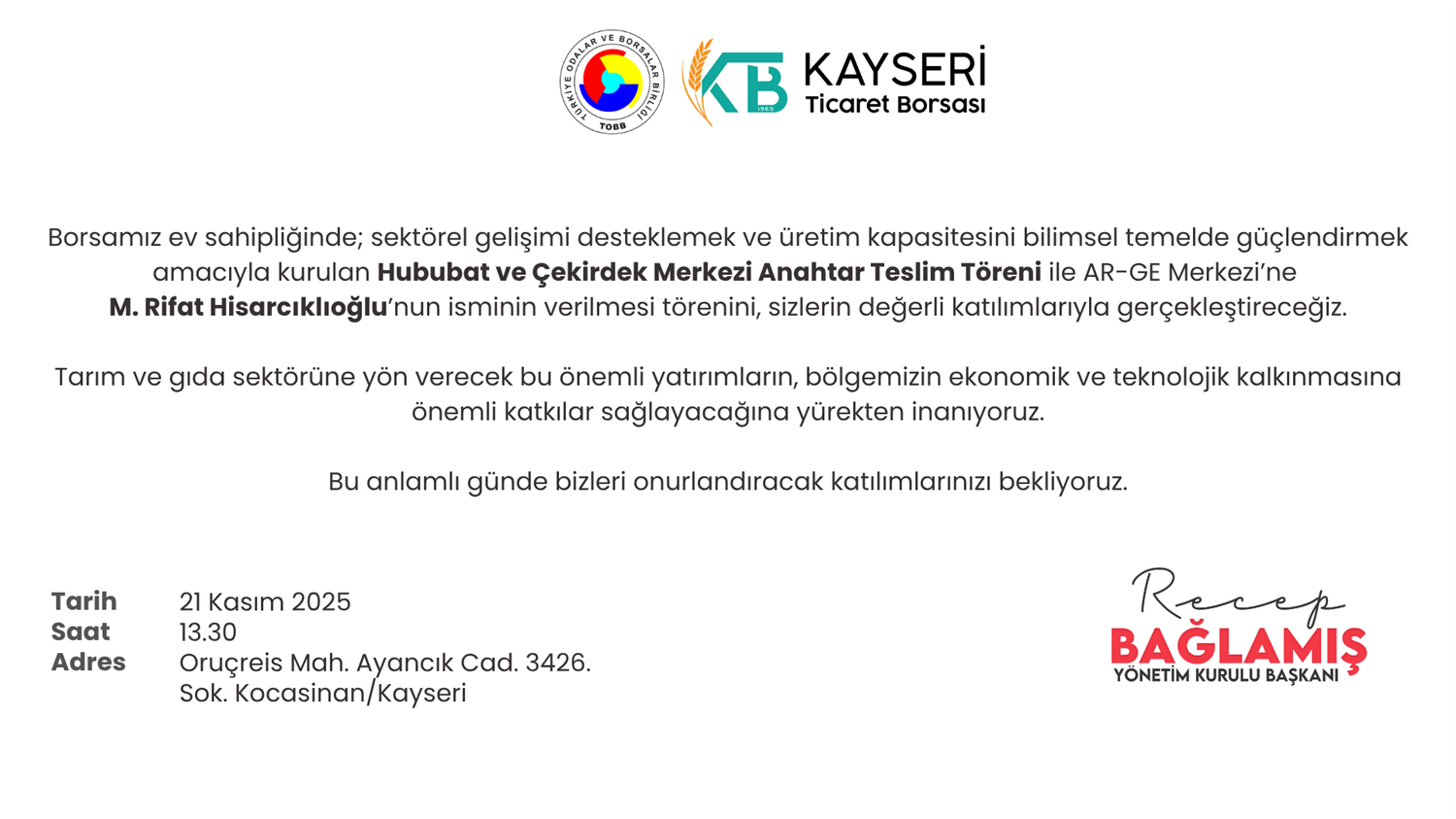 Kayseri Ticaret Borsası olarak, bölgesel ekonomiyi ve ticari faaliyetleri geliştirmek amacıyla düzenlediğimiz etkinliklerle, üyelerimize ve paydaşlarımıza geniş bir yelpazede destek sunuyoruz.