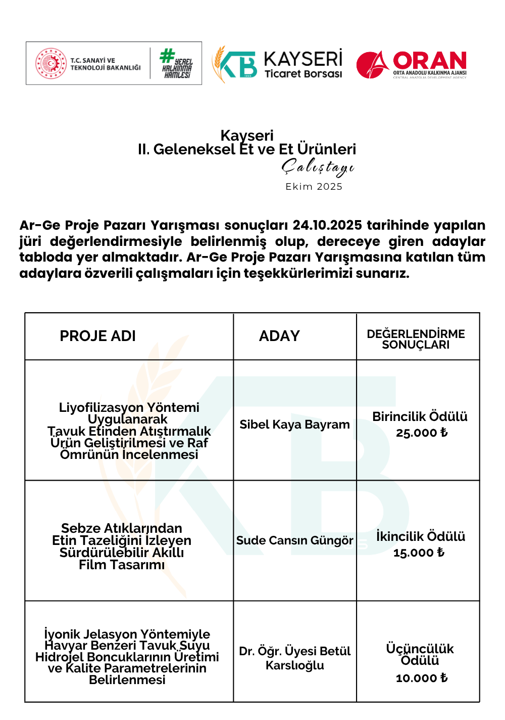 Kayseri II. Geleneksel Et ve Et Ürünleri Çalıştayı Arge Proje Pazarı Yarışma Sonuçları 2025